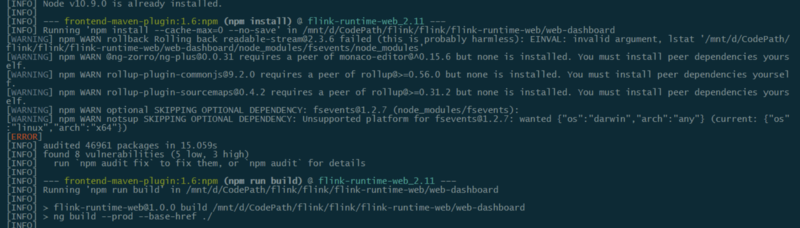 我在 Win10 的 Linux 子系统中编译 flink 发现,编译 flink-runtime-web 过程中执行“ng build –prod –base-href ./”命令非常慢,最后虽然编译过了,但差不多花了一个小时的时间。