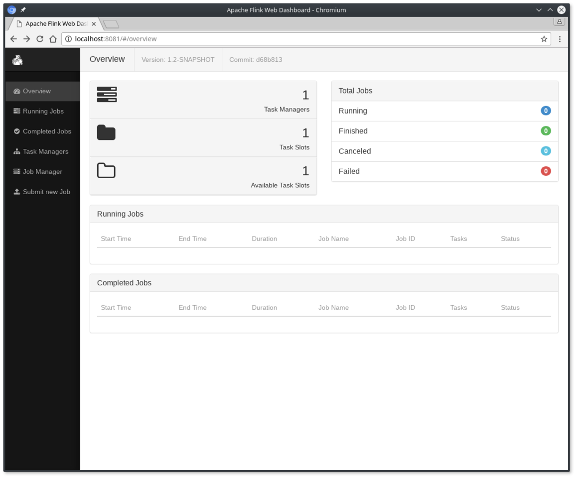 检查分派器的web前端在HTTP://本地主机:8081,并确保一切都正常运行。Web前端应报告单个可用的TaskManager实例。