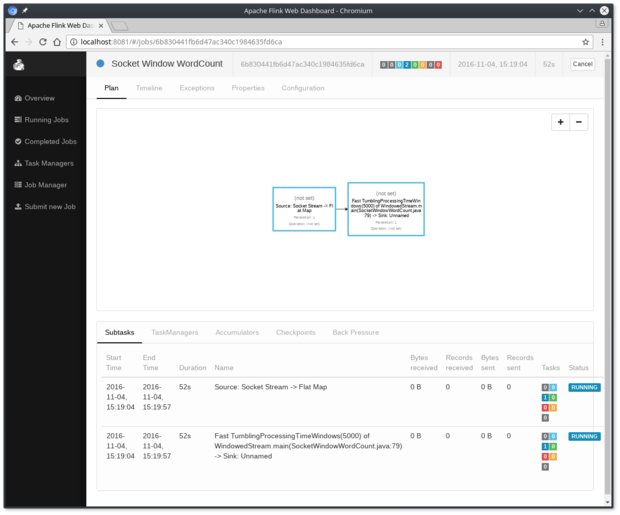 $ ./bin/flink run examples/streaming/SocketWindowWordCount.jar --port 9000 Starting execution of program