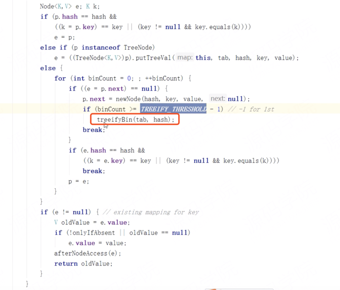 - 原因是因为链表过长,解决平衡性,JDK8 引入红黑树来解决链表查找的速度,但同样也带来一个问题:插入变慢,它默认有个阀值默认8才会转变成红黑树,源码如下:
