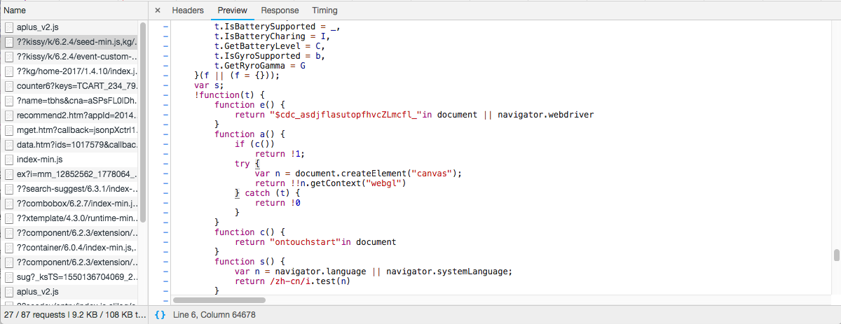 淘宝的反爬机制是非常完善的,在用selenium登陆淘宝的时候发现淘宝能检测到并弹出滑块,然后无论怎么滑动都通过不了,在经过一番搜索后发现很多网站对selenium都有检测机制,如检测是否存在特有标识 $cdc_asdjflasutopfhvcZLmcfl 、navigator.webdriver等。根据这条线索,可以在淘宝的js里找到了相关的检测代码: