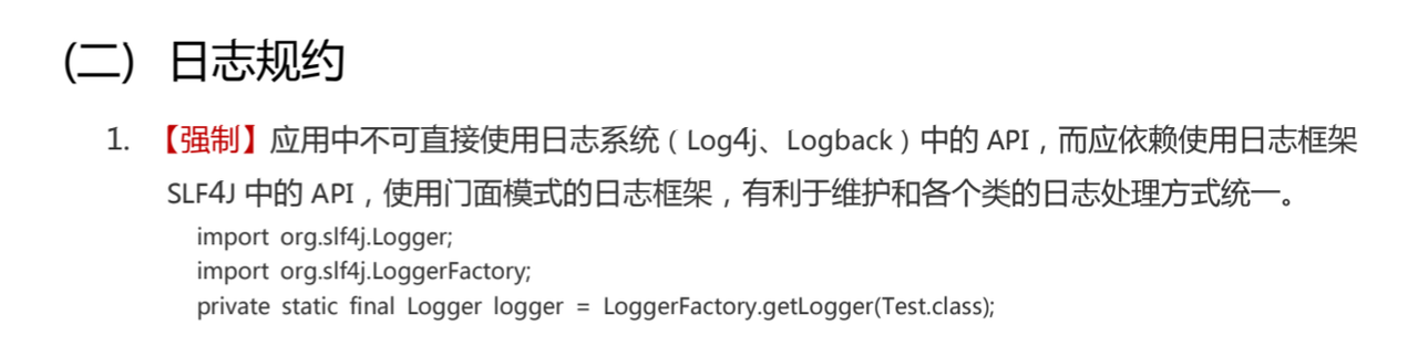 在阿里巴巴《Java开发手册》中,在日志规范的第一条中,就是禁止直接使用上面所列的日志框架的 API,而应该使用像 SLF4J 日志门面的 API。