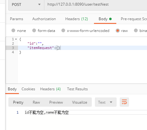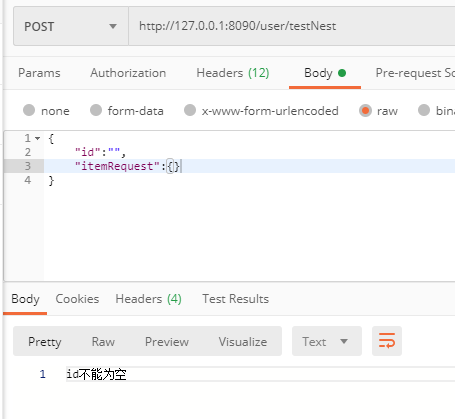 只校验了id,没有校验嵌套对象中的name属性,如果需要校验嵌套对象中的属性,需要改造一下TestNestRequest类,在itemRequest属性上加上@Valid注解,方能校验嵌套对象中的属性