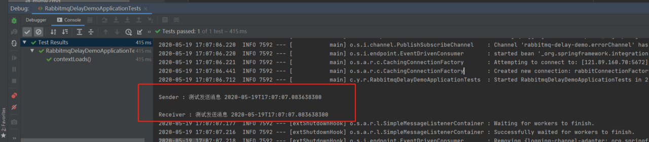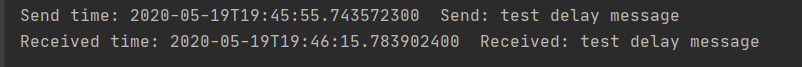 这里看到已经有一条消息进来了,由于我们发送时设置延迟时间为20秒,等待20秒之后,在idea控制台查看信息