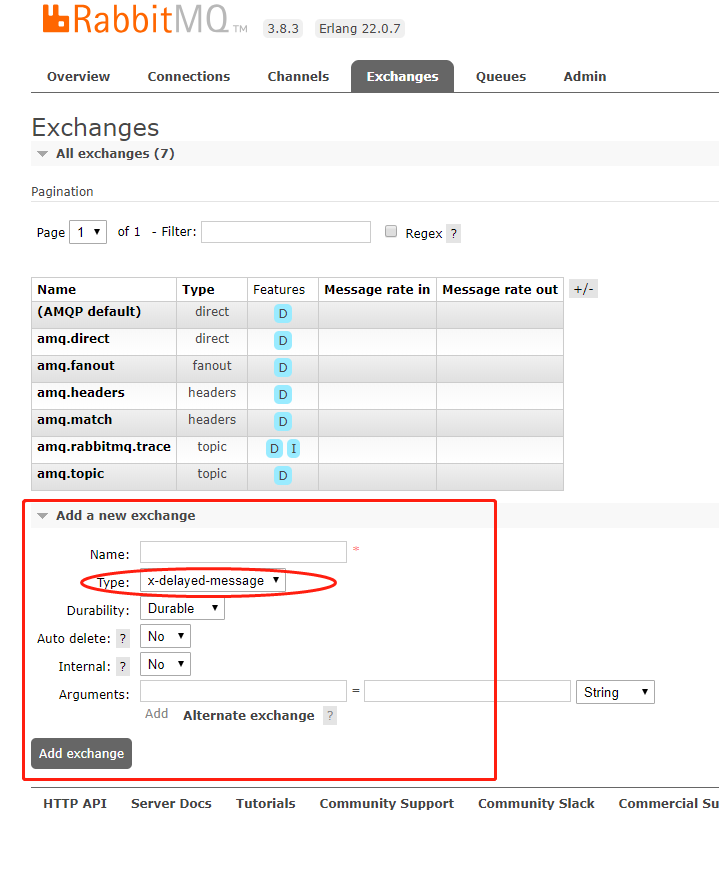 看到type有可选为x-delayed-message类型,即表明延时插件安装成功。