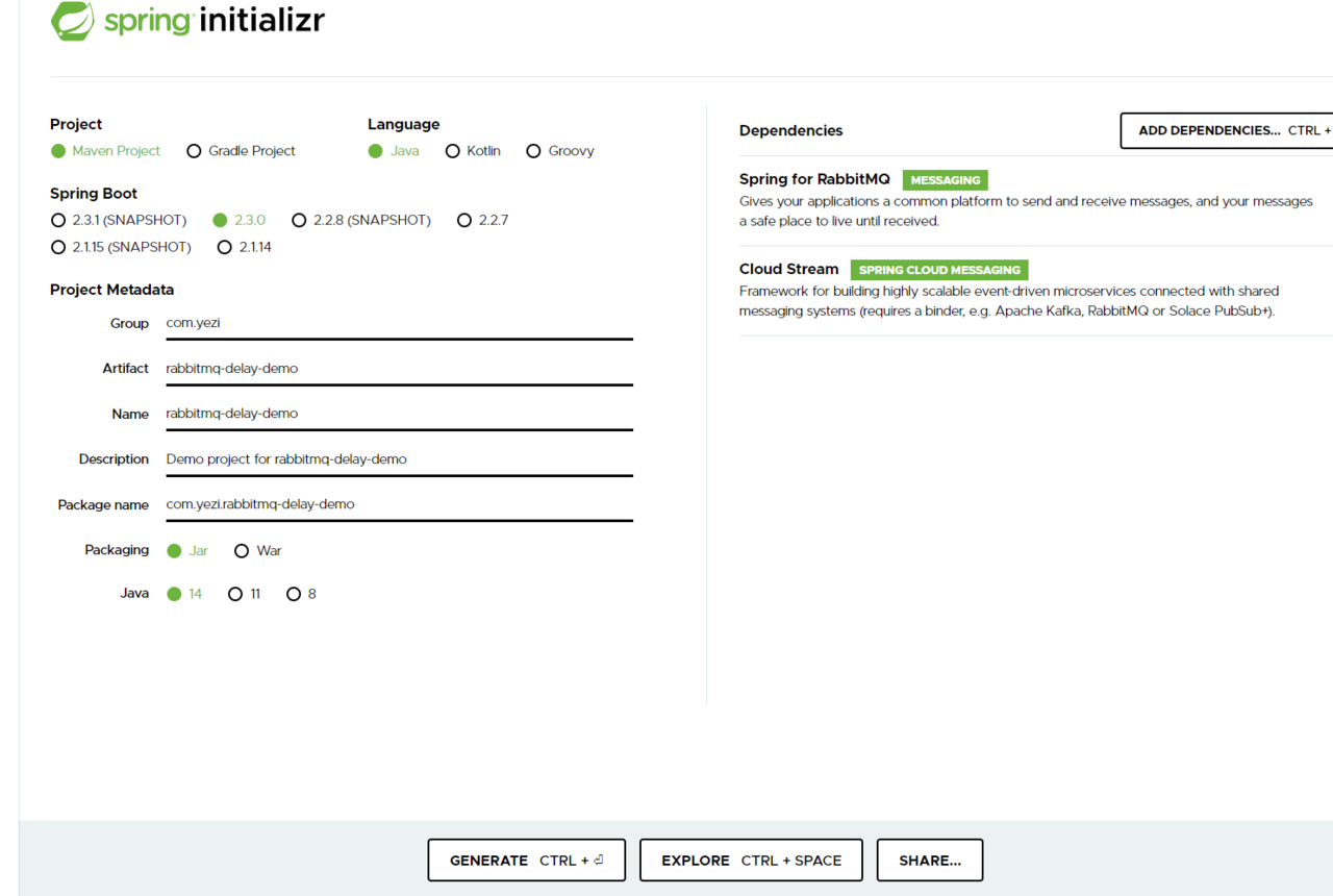 本文已经选好了后面将要使用到的依赖,点击下方generate生成工程,解压到java工作环境,使用idea打开即可。