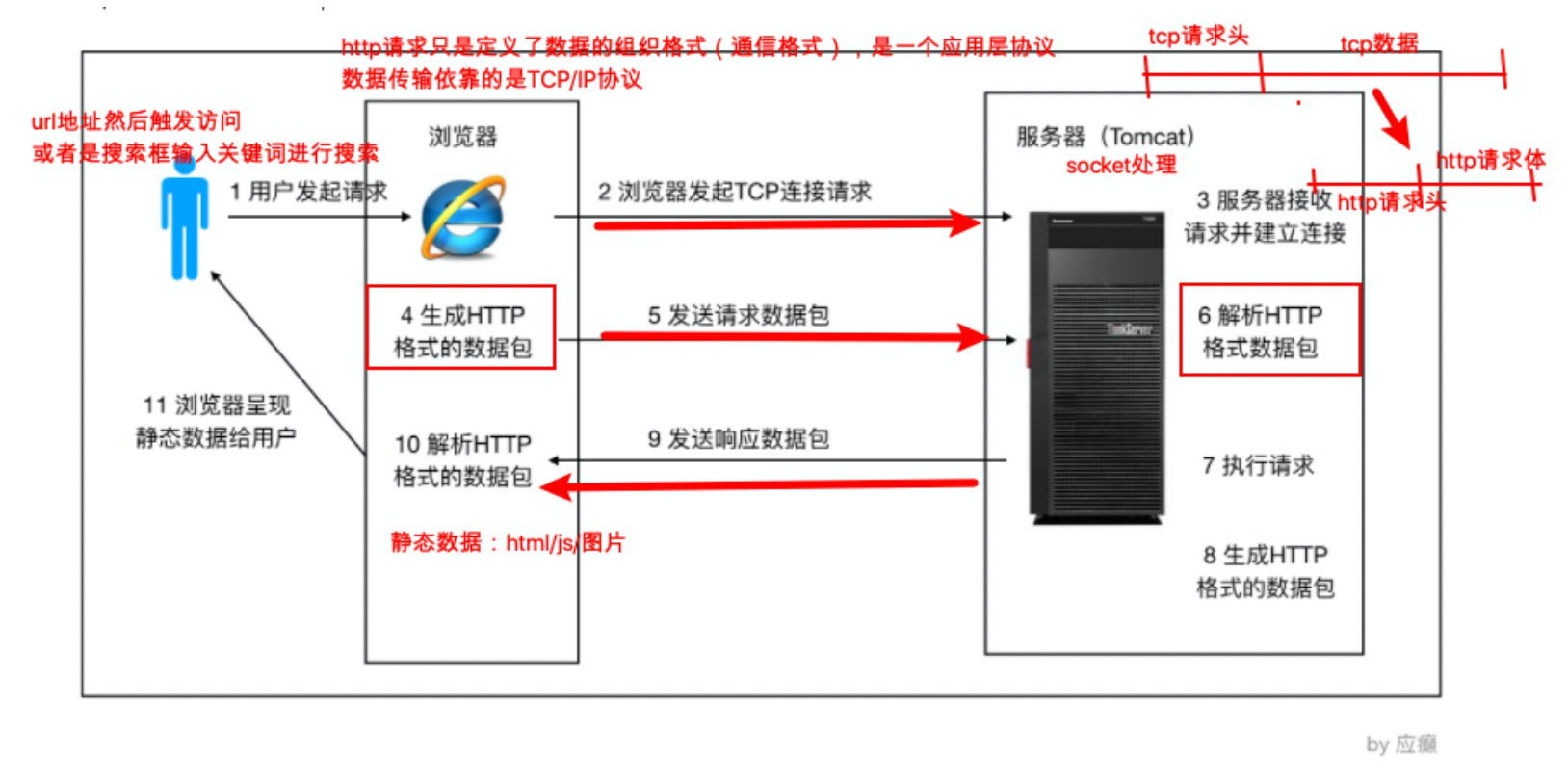 浏览器访问服务器使用的是Http协议,Http协议是应用层协议,用于定义数据通信的格式,具体的数据传输使用的是TCP/IP协议。