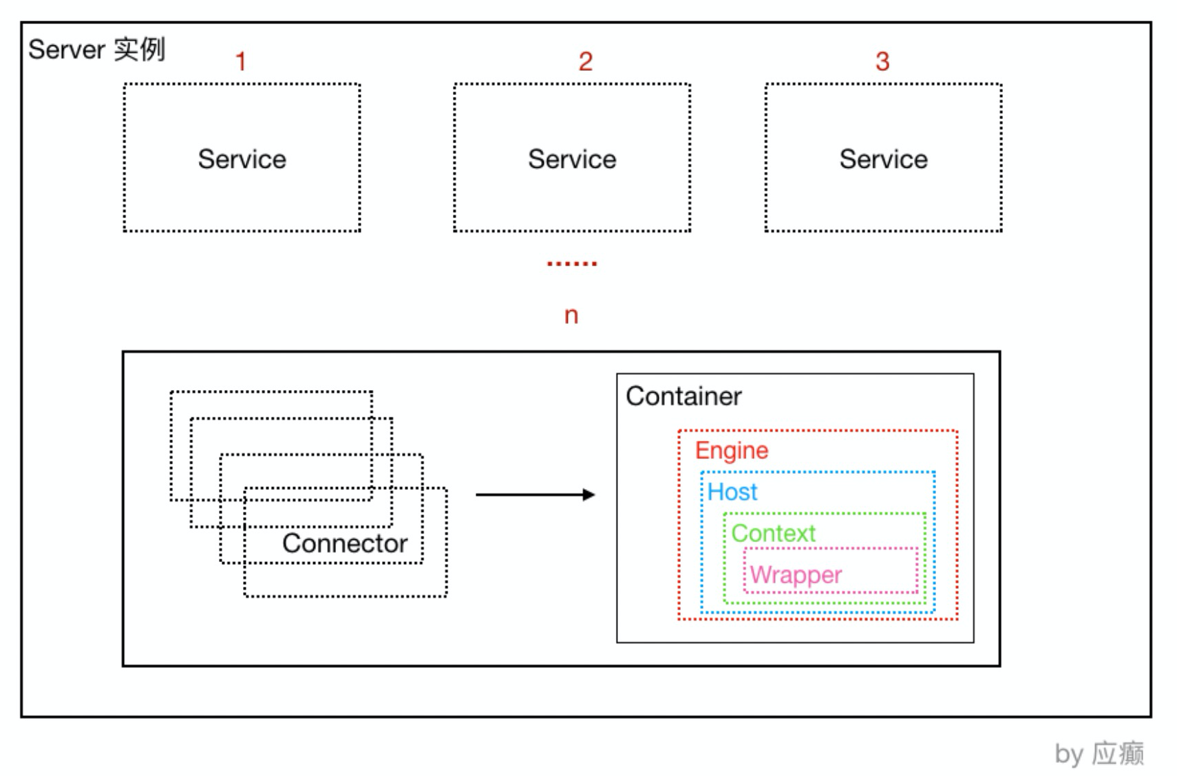 其实,可以认为整个Tomcat就是⼀个Catalina实例,Tomcat启动的时候会初始化这个实例,Catalina实例通过加server.xml完成其他实例的创建,创建并管理⼀个Server,Server创建并管理多个服务(Service),每个服务(Service)⼜可以有多个Connector和⼀个Container。