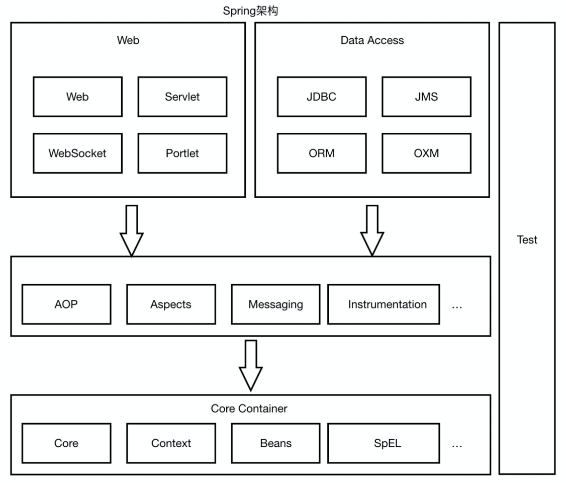 Spring是⼀个分层⾮常清晰并且依赖关系、职责定位⾮常明确的轻量级框架,主要包括⼏个⼤模块:数据处理模块、Web模块、AOP(Aspect Oriented Programming)/Aspects模块、Core Container模块和 Test 模块,如下图所示,Spring依靠这些基本模块,实现了⼀个令⼈愉悦的融合了现有解决⽅案的零侵⼊的轻量级框架。