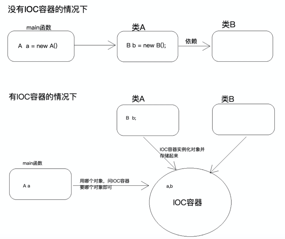 传统的开发方式,若类A依赖于类B,往往会在类A中new一个类B。 - 有IoC容器的情况下