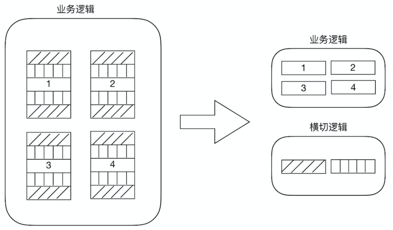 - 在多个纵向(顺序)流程中出现的相同子流程代码,我们称之为横切逻辑代码。