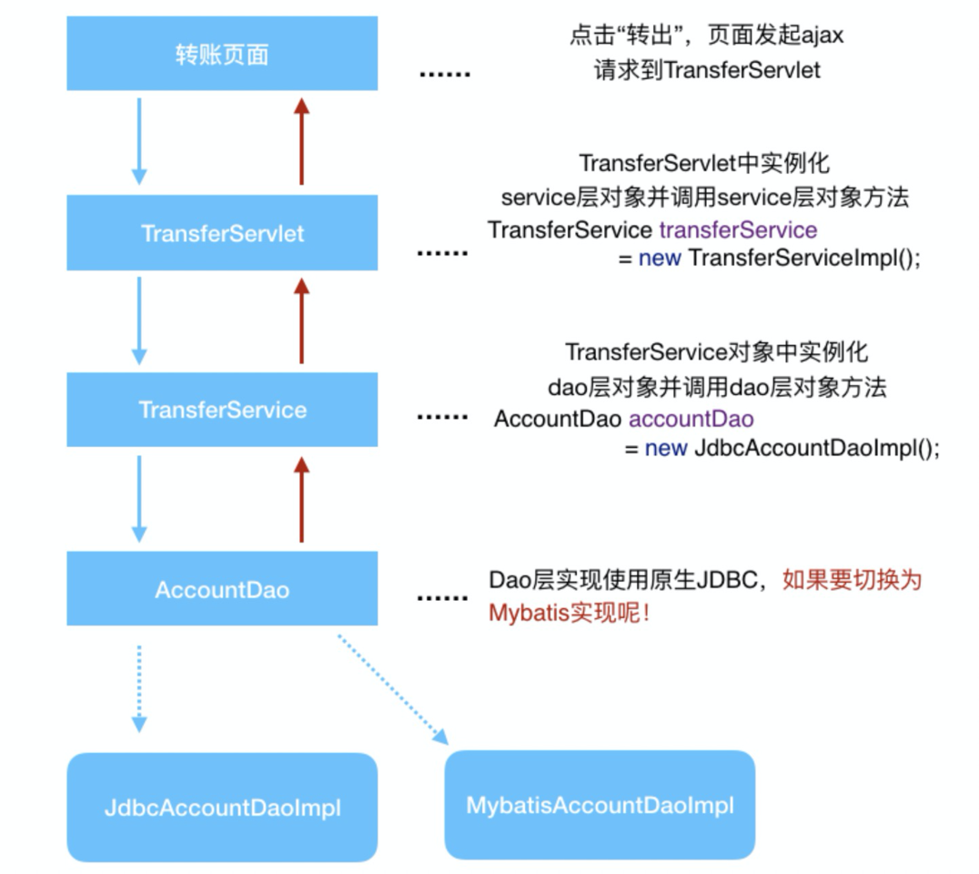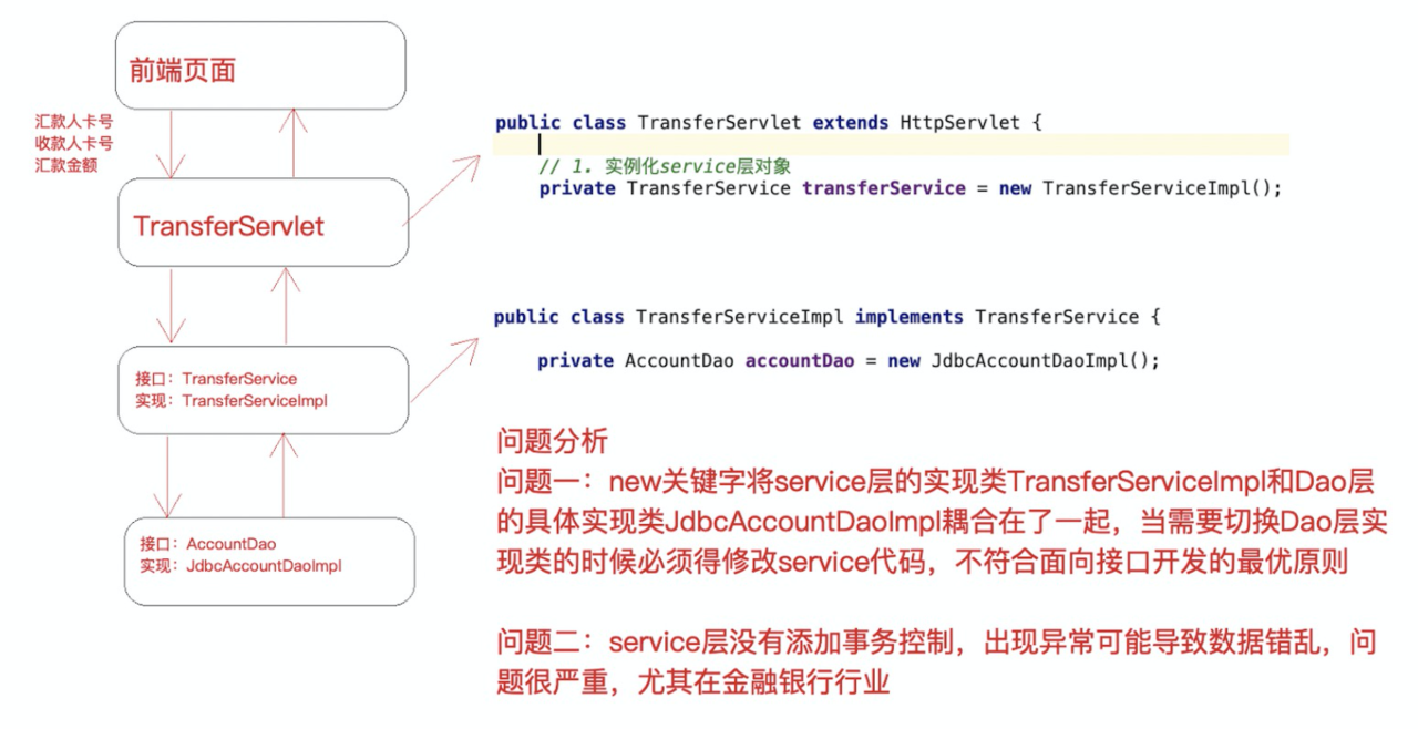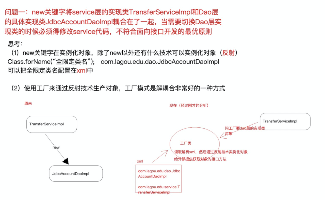 new关键字实例化对象来使用,将dao层的实现类AccountDaoImpl和service层的实现类TransferServiceImpl耦合在了一起,当dao层更换了实现类,就要修改service层的代码,面向接口开发的优势大打折扣。 -
