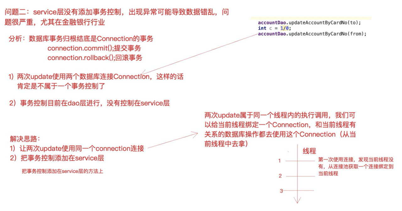 service层添加上事务控制,⼿动控制JDBC的Connection事务,但要注意将Connection和当前线程绑定(即保证⼀个线程只有⼀个Connection,这样操作才针对的是同⼀个Connection,进⽽控制的是同⼀个事务)。