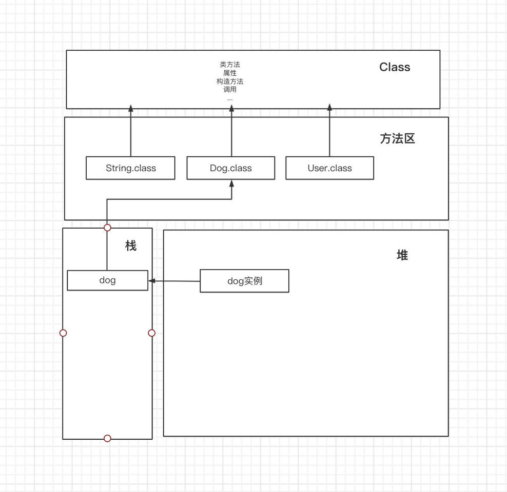 String类、Dog类在方法区中的类文件代码中,存了属性、构造方法、方法等信息,其实在Class中也就定义了Field、Constructor、Method这些信息,相当于定义一个对象的接口