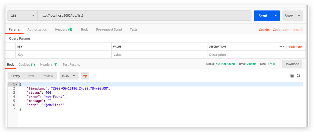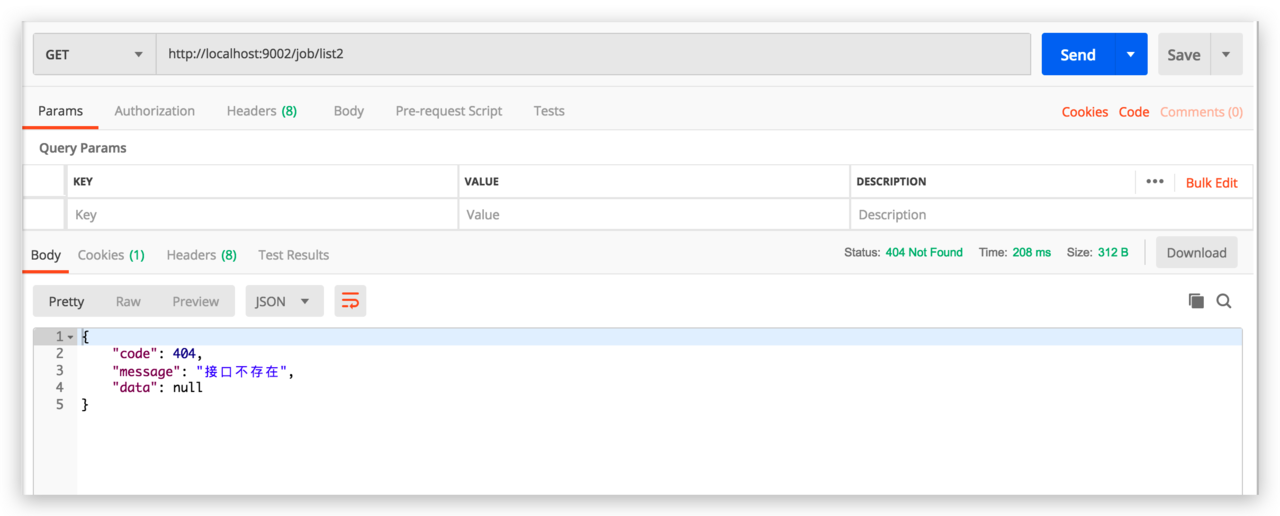@RestController public class NotFoundException implements ErrorController { private static final String ERROR_PATH = "/error"; @RequestMapping(ERROR_PATH) public Result error() { Result result = new Result(); // 2、接口不存在 result.setCode(ResultCode.NOT_FOUND).setMessage("接口不存在"); return result; } @Override public String getErrorPath() { return ERROR_PATH; } }
