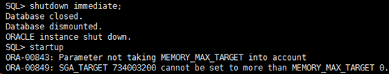 发现数据库无法重启,提示SGA_TARGET的值应该小于MEMORY_MAX_TARGET。很明显,在修改了之后,sga_target=700M,而memory_max_target=0。这个问题的原因是Oracle启动过程中对于参数的内部检查。因为MEMORY_MAX_TARGET被“显式”的赋值,与SGA_TARGET赋值相冲突。