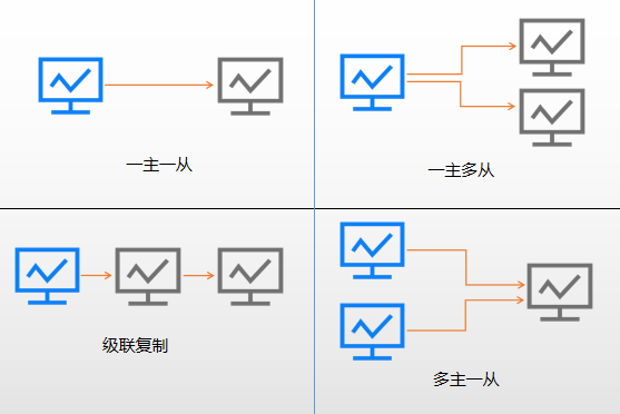 最常用的复制架构有:一主一从、一主多从、级联复制、多主一从。架构图如下: