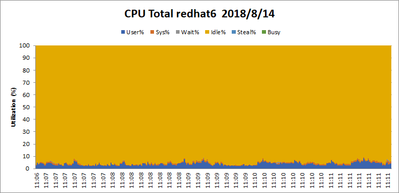 接着点击“Analyze nmon data”按钮,将需要分析的*.nmon文件加载到excel中,分析完成后,会生成一个新的excel,里面记录了服务器的各项参数信息,我们简单的看几个图形: