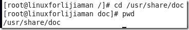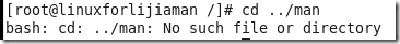 - 相对路径写法:不是由“/”写起,例如要由/usr/share/man转移到/usr/share/doc,可以写成:cd ../doc 。不过值得注意的是,假如我想从跟目录“/”跳转到“/usr/share/man”,直接写成:cd ../man是不行的。如下图: