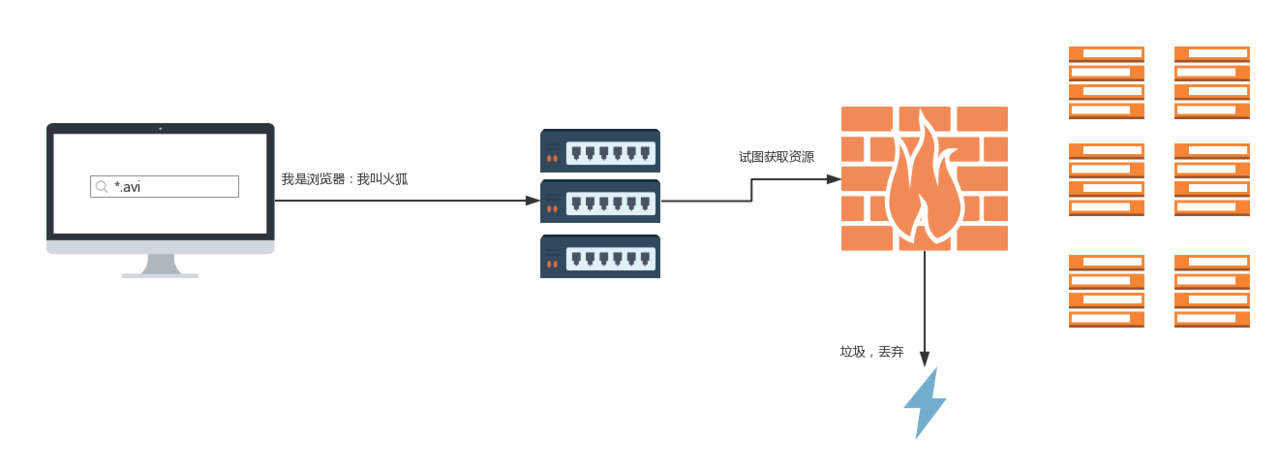 反爬虫的过程如上图所示,相当于在服务器和资源之间建立了一道防火墙,在黑名单中的请求将会被当成垃圾丢弃掉。