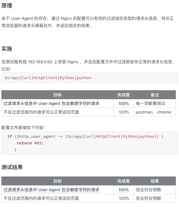 我们从遇到的反爬虫现象开始入手,接着学习了 User-Agent 这种反爬虫策略的原理,并且通过 Nginx 实现了反爬虫,最后通过 Python 代码示例和 Postman 示例来验证我们的想法,最终清清楚楚、明明白白的了解到其中的缘由,待目标改变了它的策略时,我们也可以清楚的知道可以使用哪些方法来绕过。