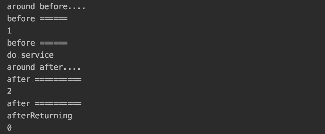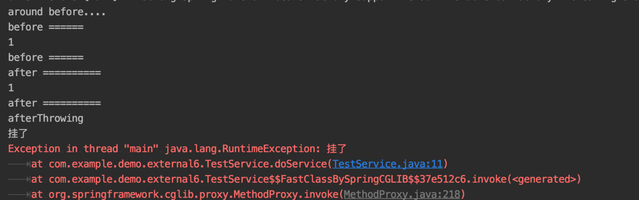 我们其实可以轻松看到执行顺序。然后我们再测试测试异常的结果,测试代码其实就是把TestService中的异常放开就行。