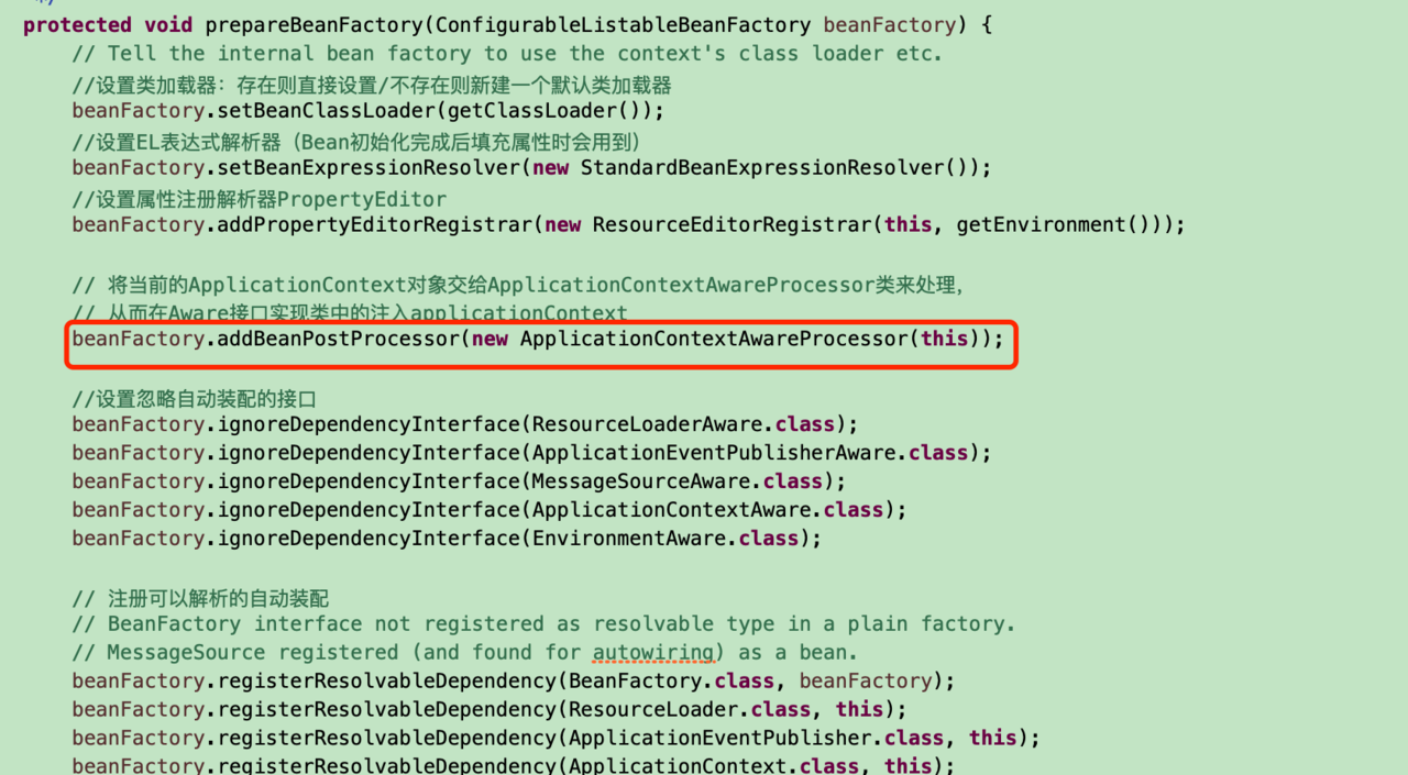 那么还有哪些常见的Aware呢?我自己最常用的一个就是ApplicationContextAware,这个接口的代码我就不贴出来了,因为和上面是一样的,就一个set方法而已,那么又是在哪个地方给我们的bean执行了setApplicationContext的方法呢?我们之前文章中介绍AbstractApplicationContext的refresh方法的时候,其中有个prepareBeanFactory方法,这个方法中有这么一句代码: