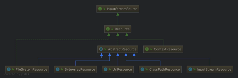 我们通过方法名字可以可以看出这些方法是想让它的实现类来做什么的,在这里我就不一一解释。然后我们一起来看看Resource类及其实现类的结构图(来自网络):
