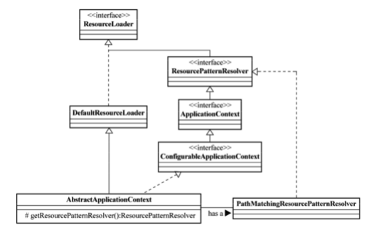 What??说好的源码你就让我看个类名?别急,我们看这个接口所继承的接口中的最后一个,原来这个ApplicationContext继承了ResourcePatternReslover接口了啊,而我们前面的文章里面提过ResourcePatternReslover它又继承了ResourceLoader接口。这里需要多提一个关于ApplicationContext的点是一般来说,各种各样场景的AplicationContext(比如最开始代码中的ClassPathXmlApplicationContext)都是直接或者间接的继承了AbstractApplicationContext,而这个AbstractApplicationContext它又继承了DefaultResourceLoader,所以说ApplicationContext具体子类的getResource方法,其实就是DefaultResourceLoader方法,然后需要加载多个资源时,AbstractApplicationContext里面还有一个ResourcePatternReslover,而它的实例就是PathMatchingResourcePatternReslover。也就是说,在需要进行资源加载的时候,ApplicationContext的实现类们完全就可以作为一个ResourcePatternReslover或者是ResourceLoader来进行资源的加载,只不过在干活的时候,还是交给具体的ResourceLoader以及ResourcePatternReslover的实例来的。我们可以看一看UML图(来自揭秘Spring):
