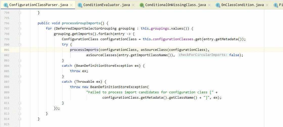 1、 ImportSelector的解析在ConfigurationClassParser#processImports中处理