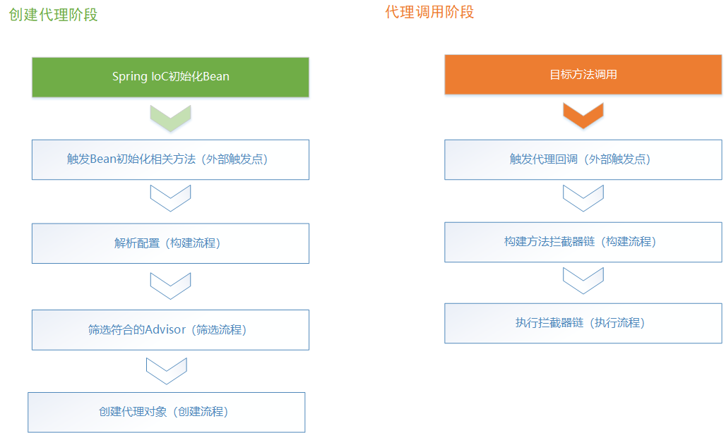 我把流程简单分为两大部分,创建代理阶段和代理调用阶段,其中前者是由Spring IoC初始化触发的,后者是由程序调用触发的,详细流程参考下图: