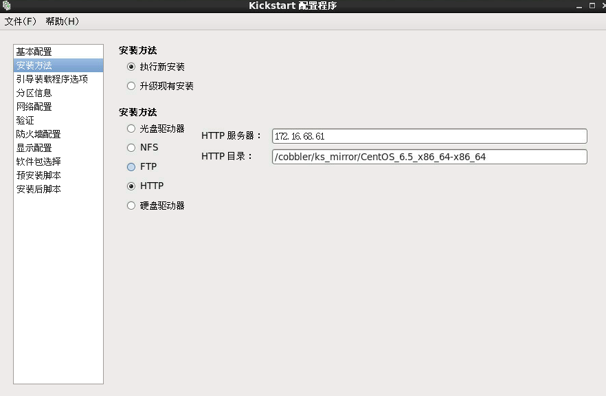 ks=http:///,安装程序在HTTP服务器上的里寻找kickstart文件.安装程序使用DHCP来配置以太网卡.例如,如果的HTTP服务器是server.example.com且kickstart文件是HTTP目录的里/mydir/ks.cfg,正确的引导命令应该是ks=http://server.example.com/mydir/ks.cfg.