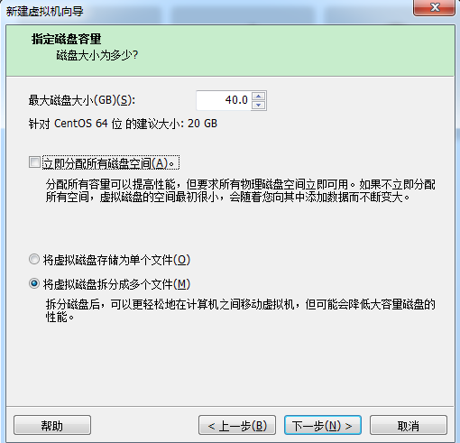 1、 设置磁盘容量20G,选择“将虚磁盘拆分成多个文件”,并点击【下一步】