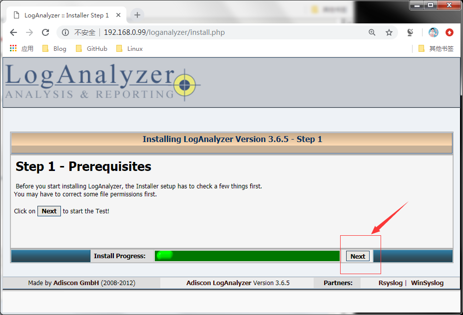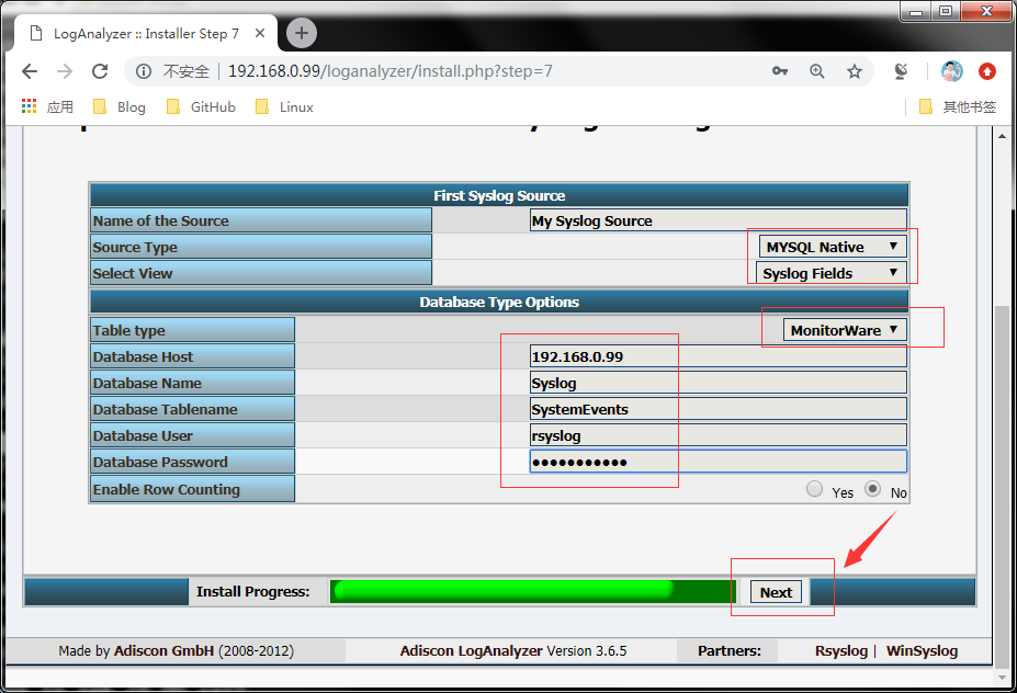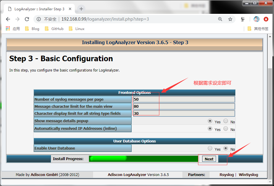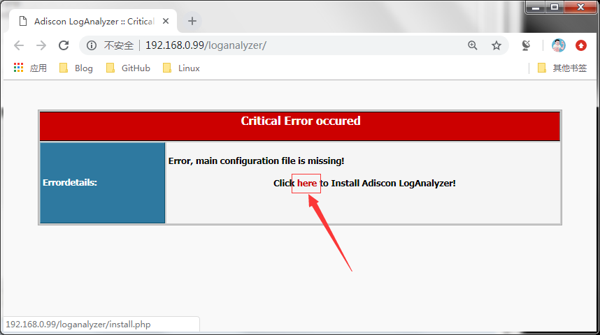 说明:启动httpd服务后,在浏览器上配置loganalyzer ,用浏览器打开http://192.168.0.99/loganalyzer 192.168.0.99是本人环境的httpd服务器地址