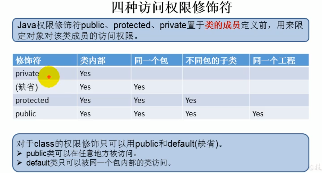 - 成员变量的修饰符有四个:public private protected 缺省,局部变量没有修饰符,与所在的方法修饰符相同