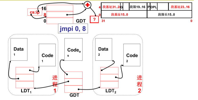 操作系统这个表放在GDT里,而每个进程有自己的LDT表(进程段表,在PCB中)