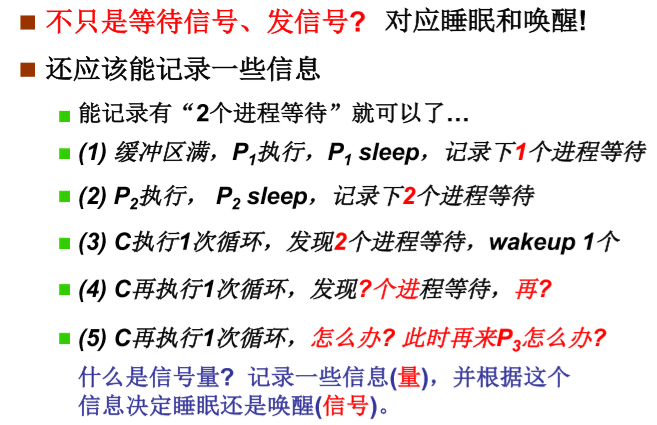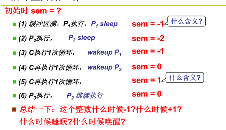 简单来说:当缓冲区满的时候,来了一个进程生产者p1,就等待,然后sem=-1,又来了一个生产者p2,也得等待,sem=-2,这个时候消费者执行1次,就唤醒一个生产者p1,sem+1,也就是sem=-1,又消费了一次,就又唤醒一个生产者p2,sem=0,此时,没有生产者等待,而又消费了一次,sem=1,说明当前有一个进程对应的资源可用,又来了一个进程生产者p3,就直接执行,sem=sem-1