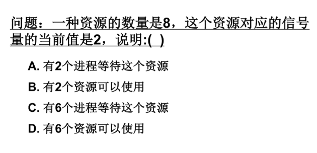 一种资源的数量是8,也就是信号量的初值是8,当sem=0的时候就是没有资源可以使用,而当前的信号量是2,也就是现在可以有2个资源使用
