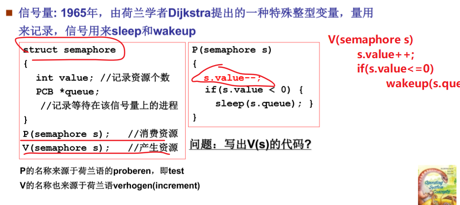 V():sem+1 ,如果sem<=0 , 唤醒一个等待的p