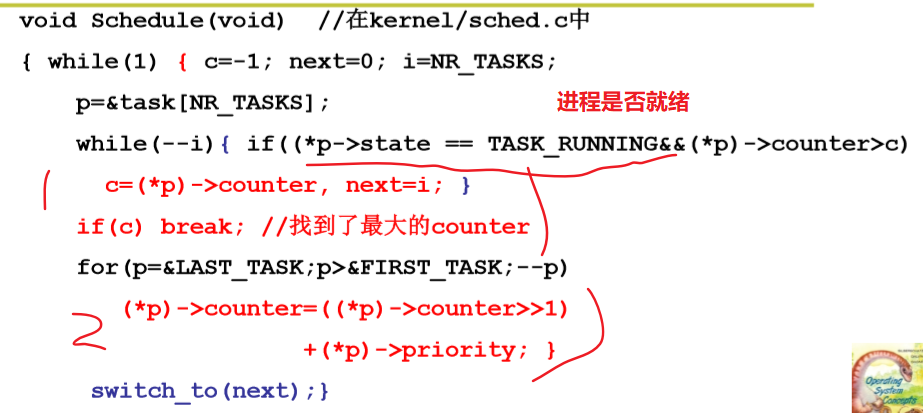 1、 也就是找到了counter最大的进程,然后就跳出去执行switch_to,对应上面的优先级算法,而counter本身也是时间片,也作了轮转调度