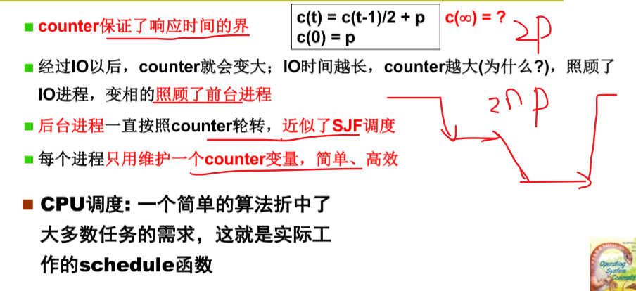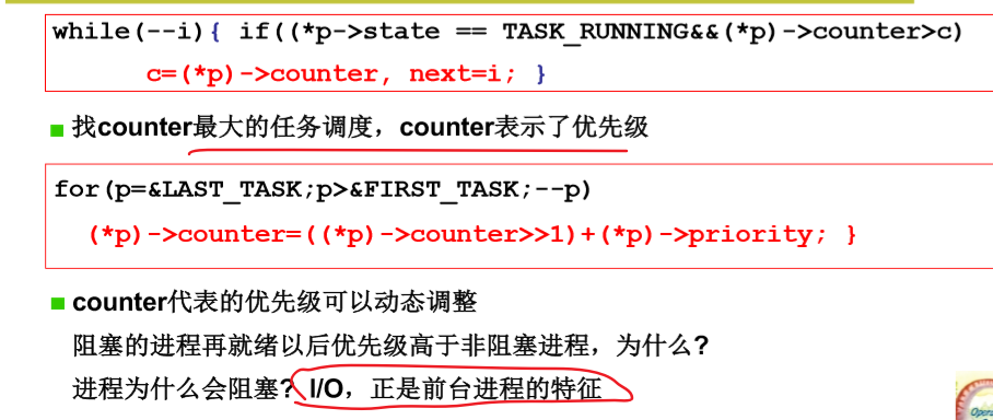 2、 现在就绪态的所有进程的时间片都用完了counter=0,右移+本身就是把counter设置成初值,而如果是其他进程,阻塞的那些进程就把counter除2再加上初值,这样的话,当阻塞态进程变成就绪态的话,也就是那些IO进程成就绪态的话,它对应的counter一定大,优先级就高,那么就先执行,而且执行的时间也稍微长点