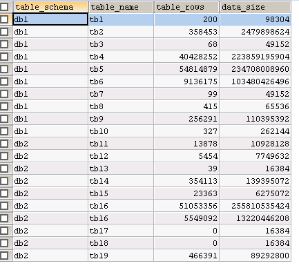 SELECT table_schema,table_name,table_rows,data_length+index_length+ data_free data_size