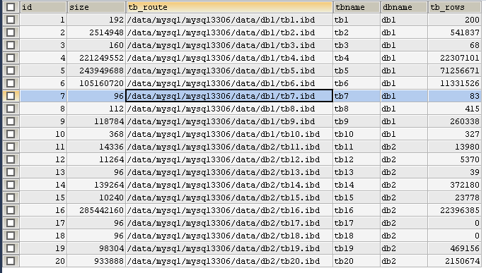 想要统计每张表的实际大小就得去遍历每个表算出对的记录数,通过查看表空间大小(每个表独立表空间)查看每个表的size。通过以下步骤即可达到精确统计的目的。