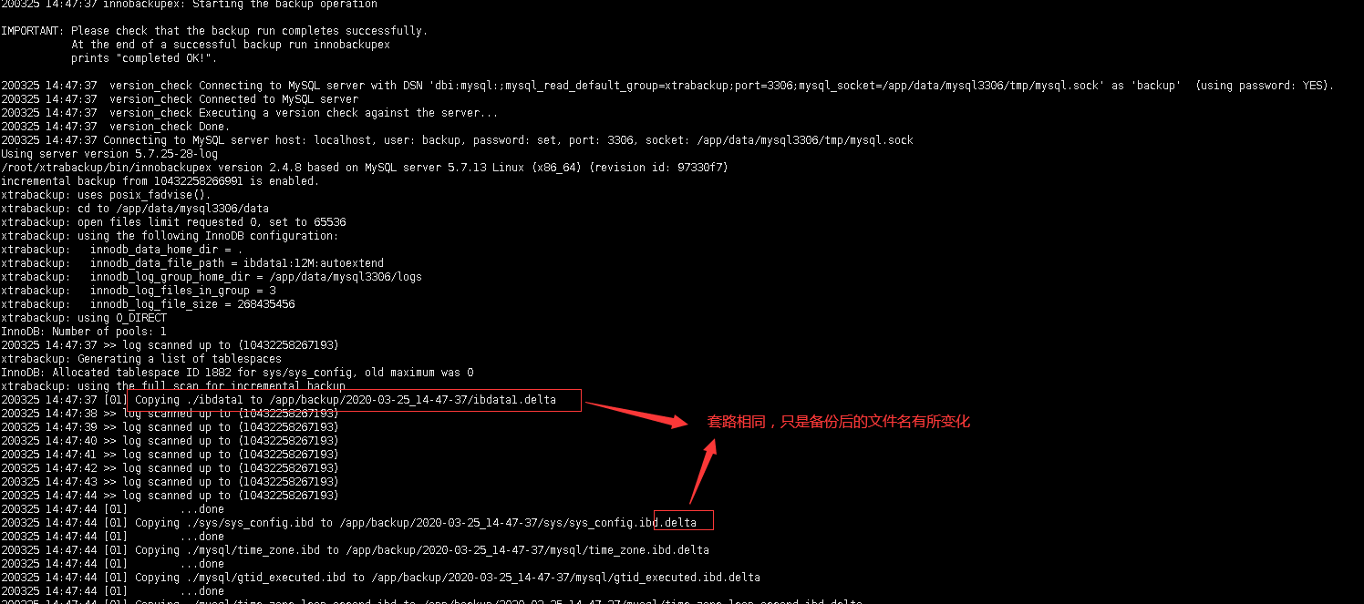 备份的过程和全量备份很相似,但是备份结果是不一样的