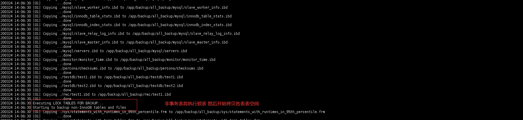 注: 如果没有添加阻塞DDL操作的参数,备份过程中如有DDL操作,备份将终止。因此建议日常备份放在从库中进行。