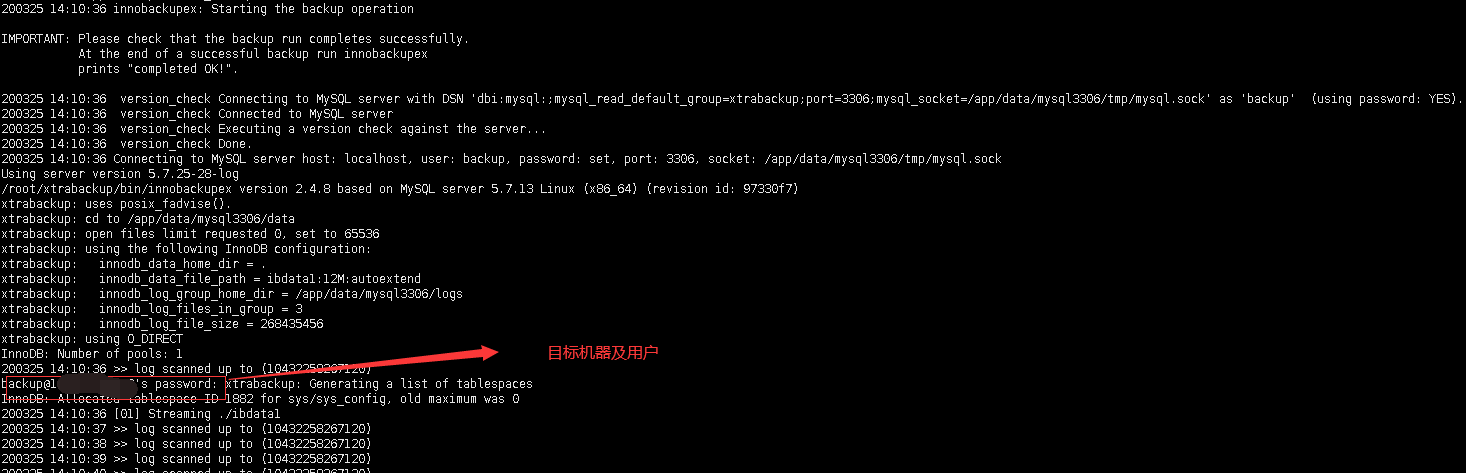 /root/xtrabackup/bin/innobackupex --defaults-file=/app/data/mysql3306/etc/my.cnf --socket=/tmp/mysql.sock --port=3306 --user=backup --password='Backup@123.com' --stream=tar /tmp --no-timestamp | ssh user@'target_ip' "cat - > /app/backup/remote_backup.tar"