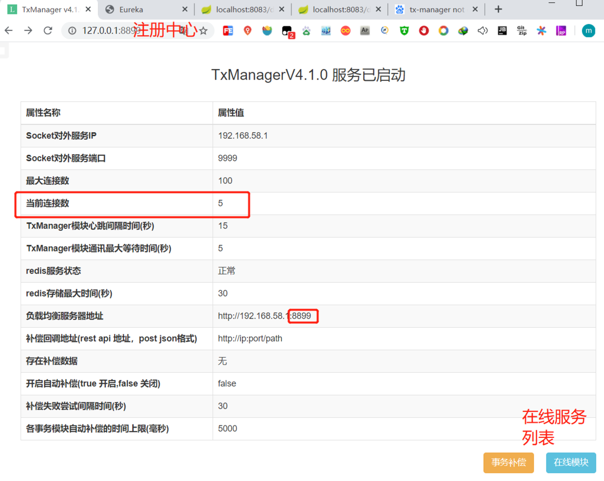 3、访问http://127.0.0.1:8899/TxManager管理界面,注意两个属性负载均衡服务器地址的端口和当前连接数,这是实验成功的截图,一开始当前连接数应该是0。