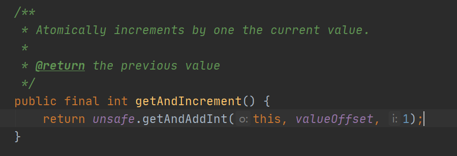 我们创建了一个AtomicInteger类型的对象,然后对该对象执行了getAndIncrement方法,该方法的作用是先获取值然后再自增1。