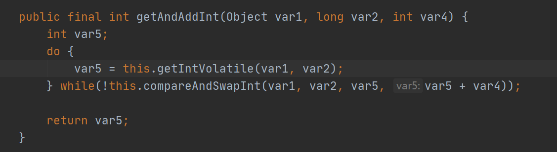 getAndAddInt方法中,var5就是期望值、var2是偏移量、var5 + var4是新值。通过一个 while循环,直到成功才会退出循环,否则将会一直重试。