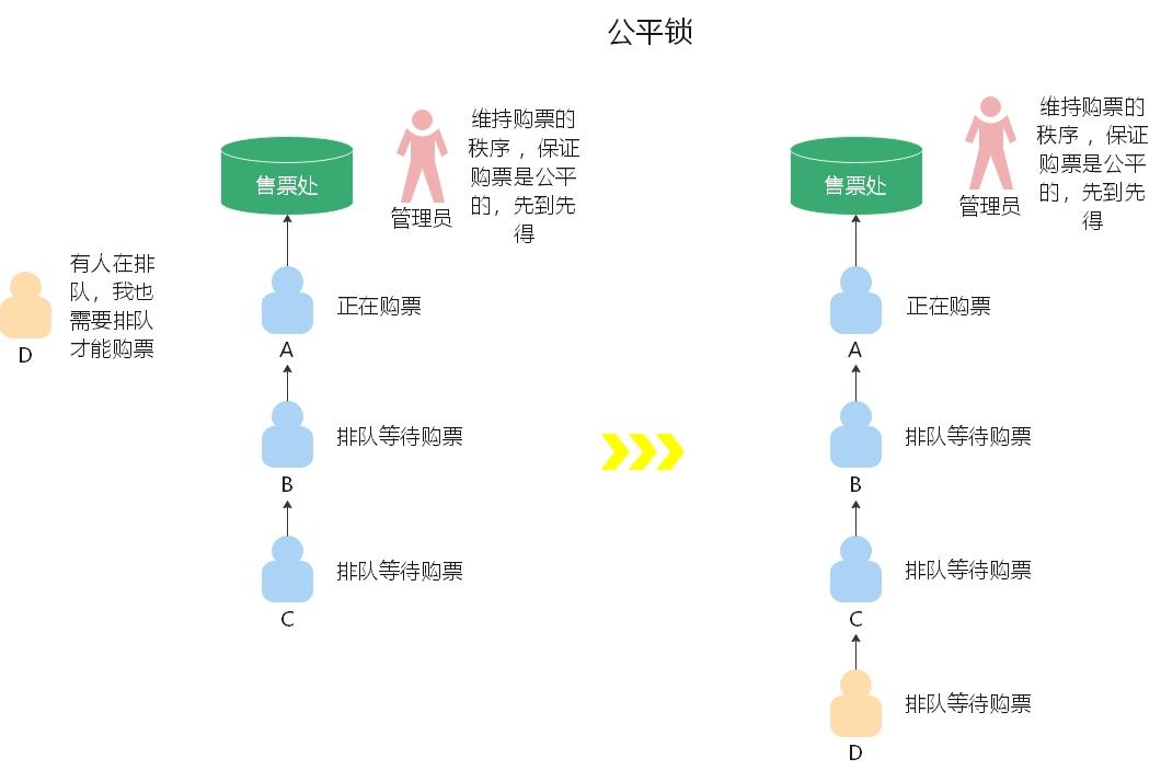 对于公平锁形象化的解释就是:有一个售票处,每个人都必须按照先后秩序排队购票,因为有管理员的存在,不会存在插队的情况,每个需要购票的用户都必须排在队伍的末尾,而且只有前面的顾客购票完成之后才可以去购票,否则只能等待。